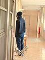 そこで、今年度は不審者役を警察官の方々にお願いし、日頃の職務経験を生かしてリアルにふるまっていただくことにしました。服装や所持品など、いかにも怪しげでした。大声で乱暴な言葉遣い、壁や扉をたたきながら歩くさまは、現実であるなら縮み上がると思います。