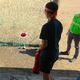 初めて触れる競技用具やボールの扱いに苦戦しながらも、中学生のアドバイスを受けながら一生懸命に体を動かしました。