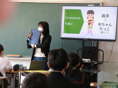 2年生の社会科の授業で、クロムブックを使った授業を行っていました。今までのパソコンの授業では、「パソコンを使って調べる」や「ドリル形式の問題を解く」、「プレゼンテーションソフトにまとめる」などが主でしたが、この授業では、自分の意見をパソコンの画面上に「ふせん」を使って貼り、班の人と意見を交換しながら考えていく、という事を行っていました。