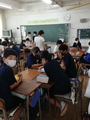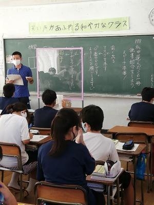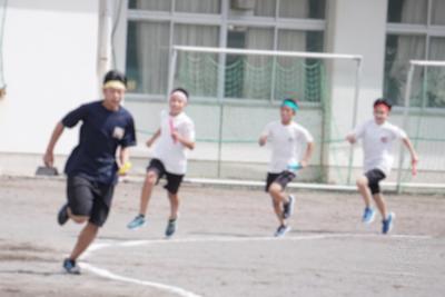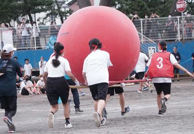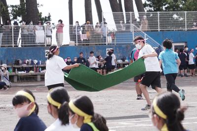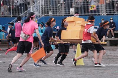 昼食をはさんで午後からは、各学年ごとのクラス全員リレー、学年種目が行われました。特に学年種目は、ソーシャルディスタンスを意識しつつも、工夫が凝らされ、1年生は段ボールを積み上げながらリレーする「段ボールダンダン運んで」という競技、2年生は大玉を2本の竹ざおで挟んで運ぶ「UBer Ball」という競技で競い合いました。