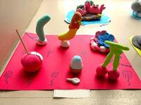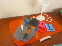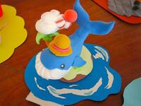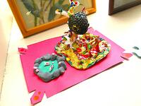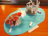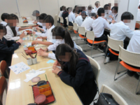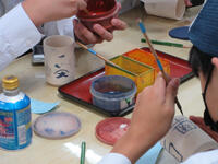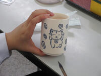 湯飲み茶碗という小さな円筒形に絵をデザインする難しさ、普段使わない小筆を用いて2色の絵の具で表現する難しさもあってか、みんな終始真剣な態度で取り組んでいました。