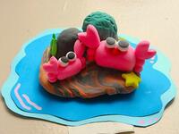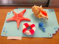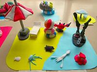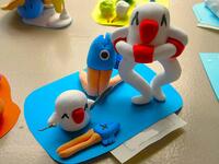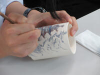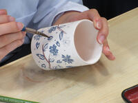 素焼きの湯飲み茶碗に鉛筆で下書きし、用意された2色の粉絵の具(赤と青)で絵付けしていきます。本焼きの際には、鉛筆の下書きが焼け落ちるのはよいとして、絵付けの部分については、普段使っている水彩絵の具やアクリルガッシュとは勝手が違い、色合いや濃淡が変わるようです。出来上がりが楽しみですね。