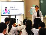 この日1年生は、身近で社会人として活躍している人たちにインタビューした内容から感じ考えたことを発表していました。仕事の内容をはじめ、その魅力や難しさ、場合によっては人生観まで聞くことができた生徒もいたようです。人前で話すことに不安があって原稿を手元に発表している生徒もいましたが、どの子も「その人(職種)にインタビューすることにした理由」「聞き取った内容に対する素朴な思い」など、自分の言葉で話すことができました。